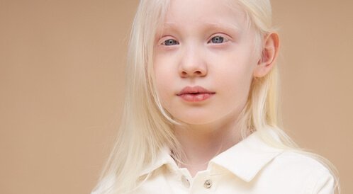 • في الجلد والشعر: قد تظهر بشرة فاتحة وشعر أبيض أو فاتح جدًا، وحساسية للشمس.